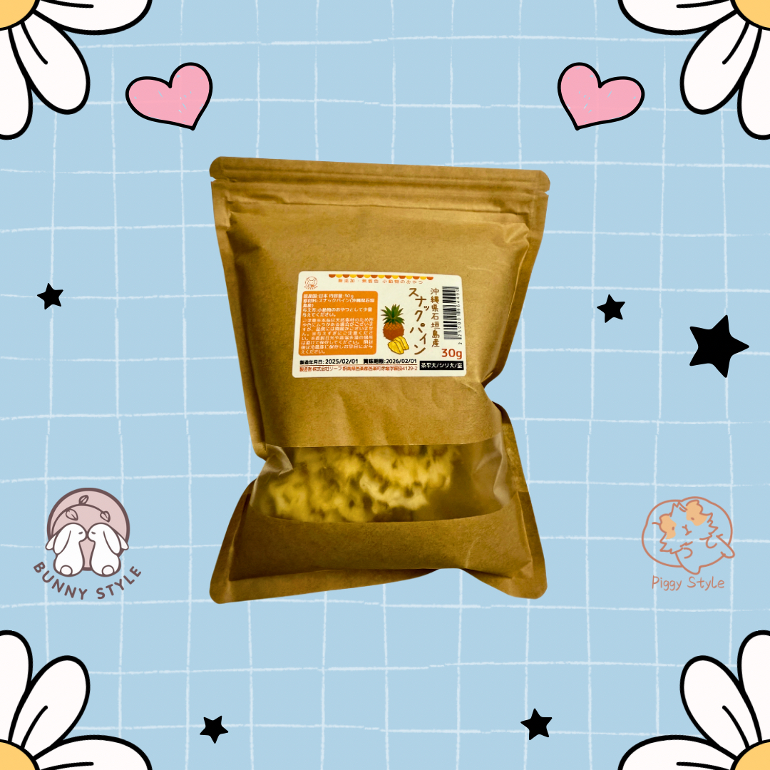 日本製!信心保證❀使用日本沖繩石垣島國產菠蘿製作的小動物零食菠蘿中含有所含的膳食纖維,可令腸胃更健康郁動低溫下緩慢乾燥、令到菠蘿乾可以保持高新鮮度不使用色素、防腐劑或添加劑。純天然安心安全零食密封口包裝袋,方便保存