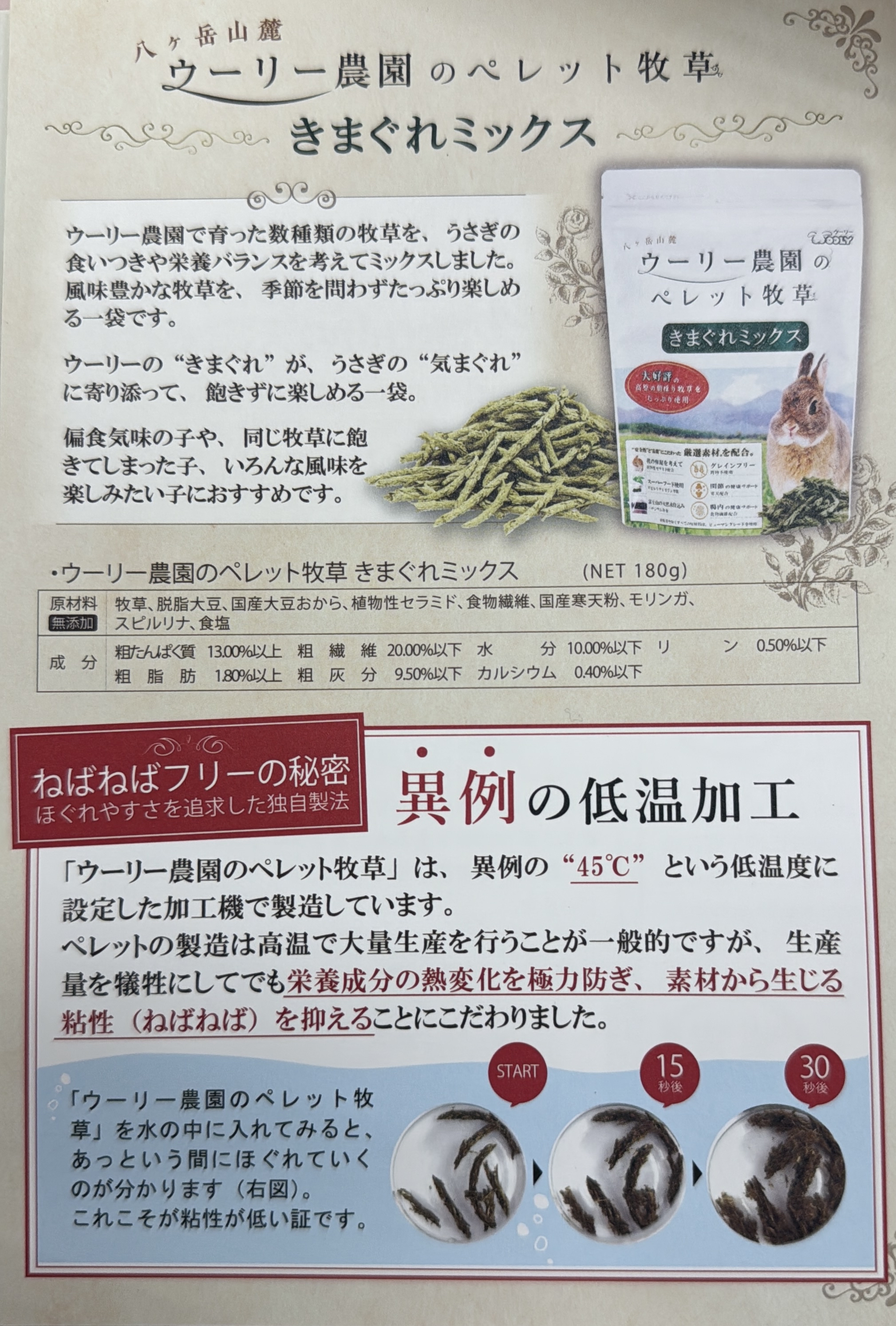 • 由日本知名品牌WOOLY自家農園直送,多種高品質牧草隨機混合製成,包裝每次都有不一樣的自然風味。 • 採用高原栽培牧草,利用純淨富士山伏流水加工,天然無添加,保留牧草豐富纖維與香氣。 • 以顆粒形式呈現,方便餵食且接近自然牧草的口感,適合兔子及其他草食小動物。 • 不含穀物,減輕腸胃負擔,有助維持腸道健康。 • 添加螺旋藻與辣木葉,提升營養價值,促進體質強健。 【適用對象】 兔子、天竺鼠、龍貓等草食小動物。 【使用建議】 • 建議作為牧草的補充飼料,搭配新鮮牧草一同供應。 • 適合挑食、不愛吃草的小動物,增加纖維攝取,促進腸胃蠕動。 • 也可作為日常健康零食替代高糖份點心。 【內容量】 180克裝,方便保存與日常使用。